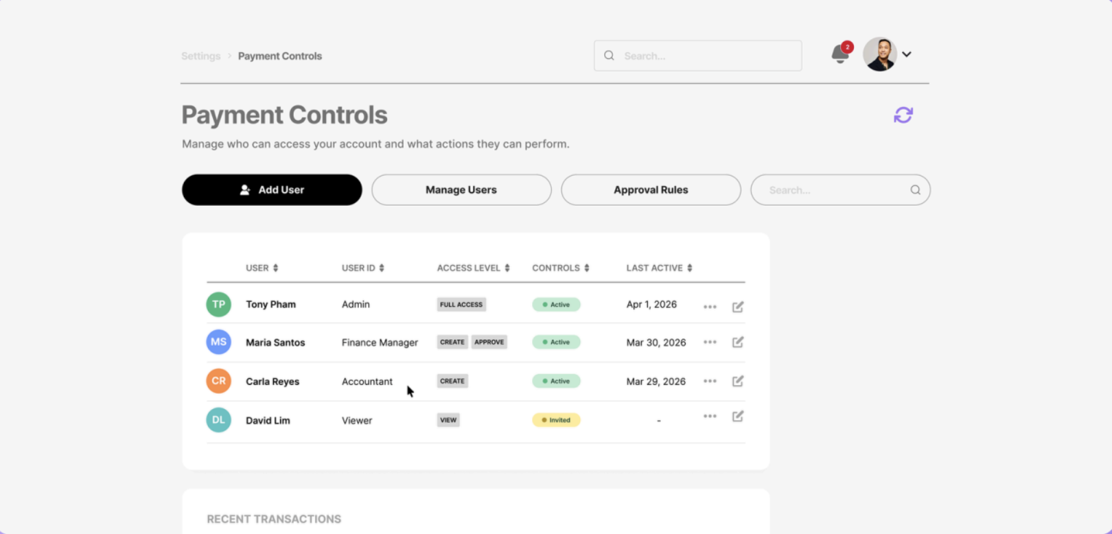 Introduce approval controls and user permissions to help your team manage payments securely.